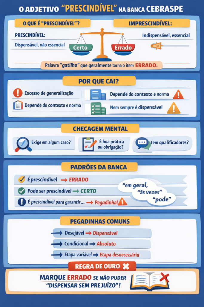 Na banca CEBRASPE, “prescindível” é um daqueles adjetivos “gatilho” que frequentemente tornam o item ERRADO, porque ele é absoluto (generaliza sem margem).