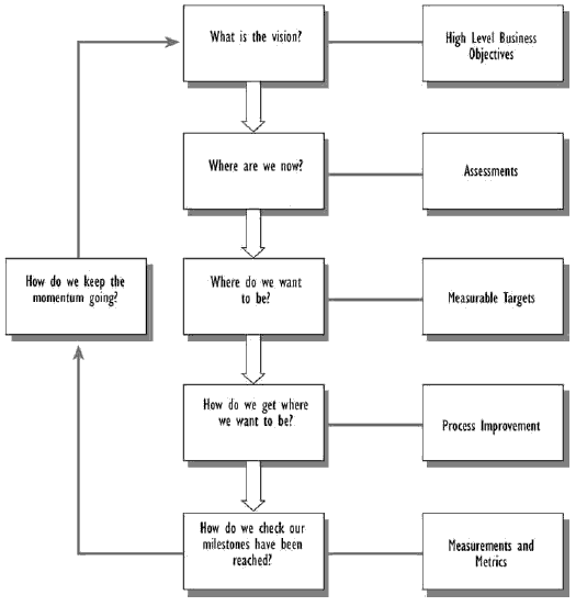 A figura acima, adaptada do sítio ocg.gov.uk, apresenta um esquema empregado na melhoria de serviços de TI. Tomando por base os elementos apresentados, redija um texto em que se esboce um plano de desenvolvimento do órgão de informática de um tribunal federal fictício. No seu texto, aborde, necessariamente, os seguintes aspectos: