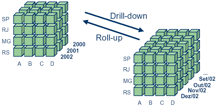 Drill Down: Realiza o detalhamento os dados. O usuário desagrupa os dados aumentando o nível de detalhe da informação. Roll Up (Drill Up): Os dados são resumidos com generalização cada vez maior, sendo o contrario do drill down, reduzindo o nível de detalhe da informação.