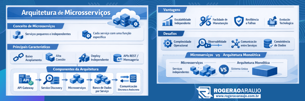 Em comparação à arquitetura monolítica, os microsserviços oferecem maior flexibilidade e escalabilidade, porém exigem uma gestão mais madura e ferramentas adequadas para lidar com a complexidade distribuída, em um layout conceitual moderno, limpo e orientado a serviços.