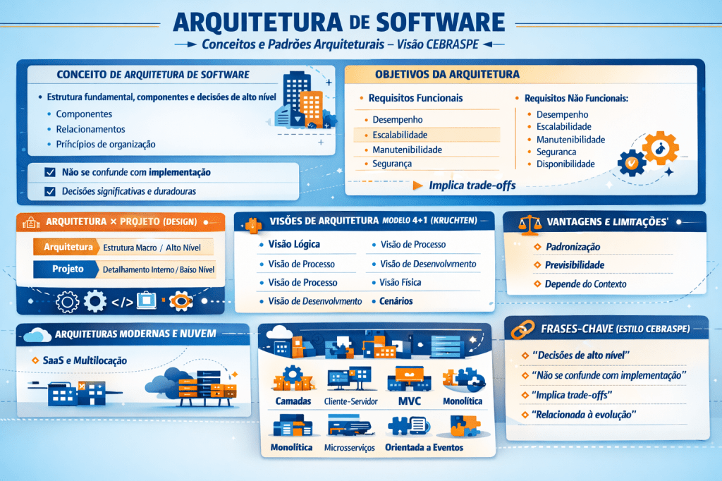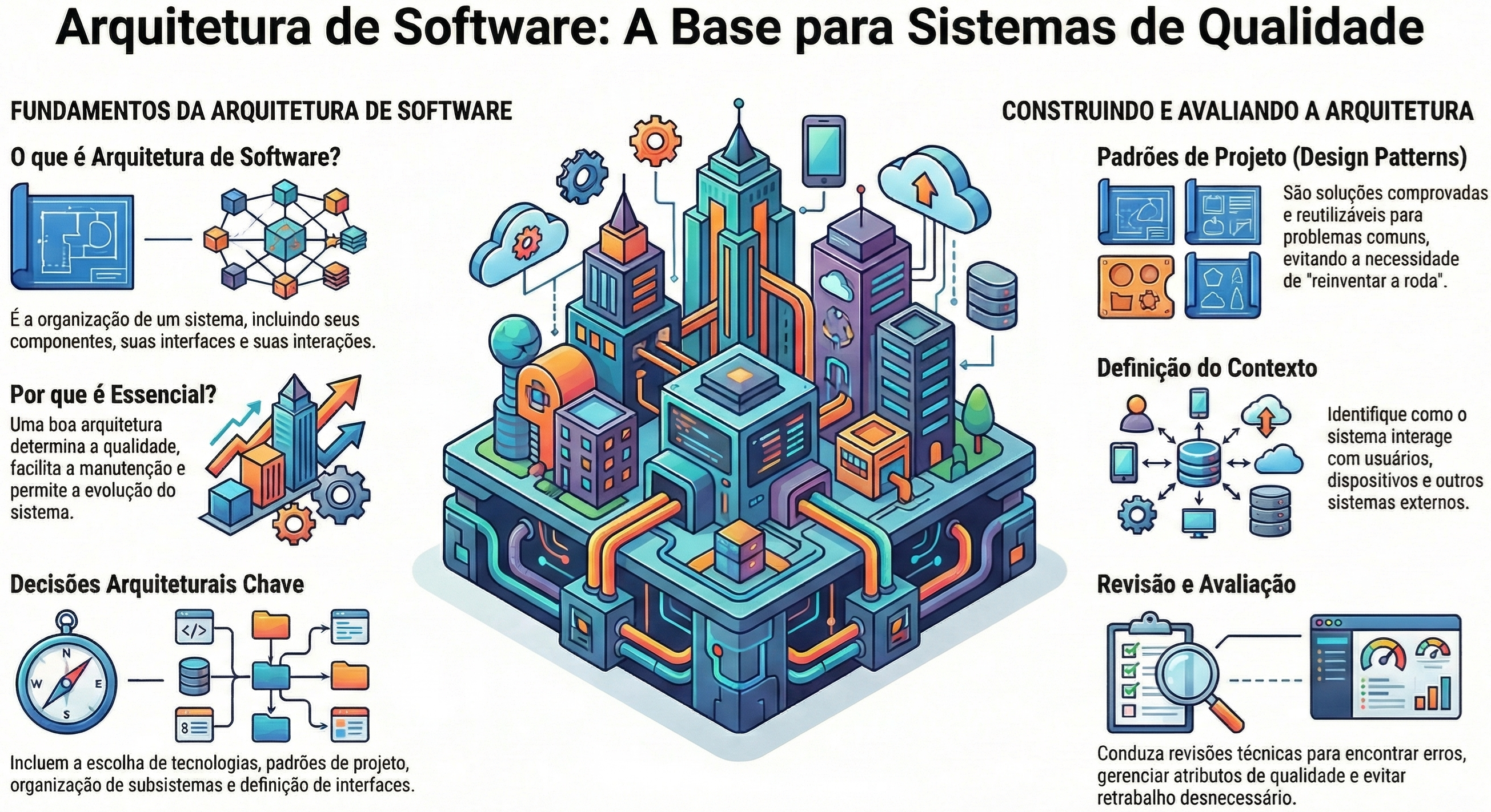 - A arquitetura atua em um nível mais alto de abstração, definindo a estrutura macro do sistema e suas diretrizes fundamentais; e