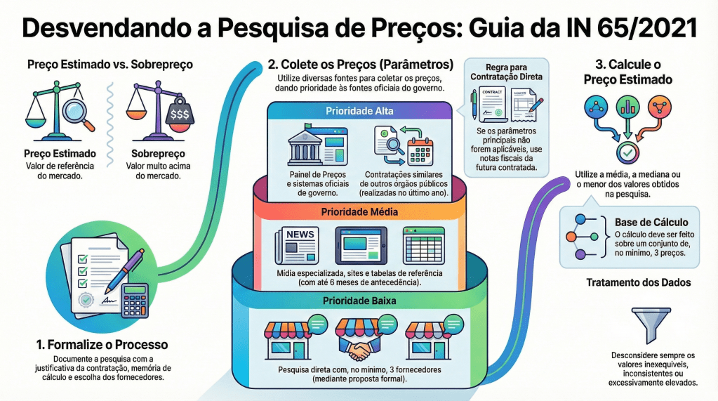 A IN SEGES/ME nº 65/2021 disciplina a pesquisa de preços nas contratações públicas federais, sendo peça-chave do planejamento das contratações.